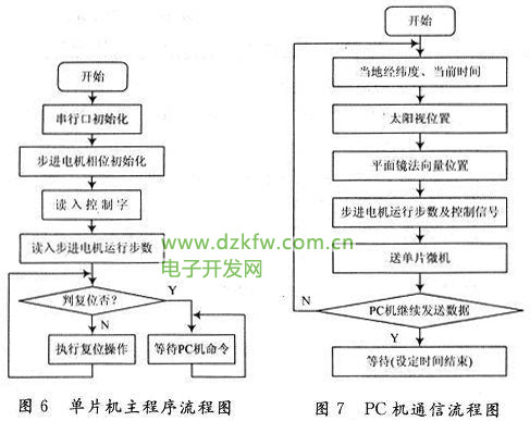 太陽自動跟蹤系統的軟件分為兩部分,一是步進電機控制部分,主要由單片機完成。單片機的軟件設計采用模塊化設計的方法,主要分為如下幾個軟件模塊:主程序模塊、串行口中斷處理模塊、正常跟蹤處理模塊、串行口中斷復位處理模塊等。單片機主程序流程圖如圖6所示。