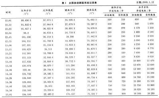 表1中列出了2009年1月12日中午至下午三時左右的理論數據,并用系統的手動校準功能,記錄下不同時刻的步進電機實際運行步數。