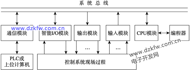 組合式 PLC 的構成如下圖所示,模塊之間通過底板上的總線相互聯系。CPU 與各擴展模塊之間若通過電纜連接,距離一般不應超過 10m。