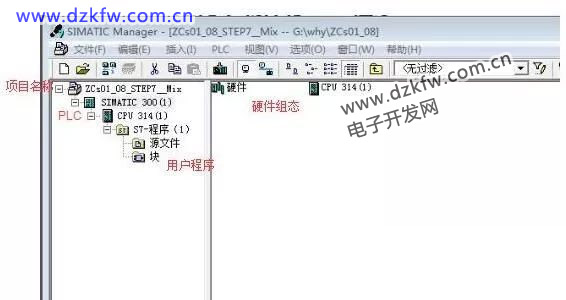 S7-300系列PLC的工程項目的建立、硬件組態、編程、下載和上裝以及程序狀態診斷和監控都由西門子的配套軟件SIMATIC Manager來管理和維護,如下圖所示。