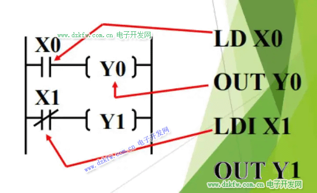 LDI:取反指令。表示一個(gè)與輸入母線相連的常閉接點(diǎn)指令。