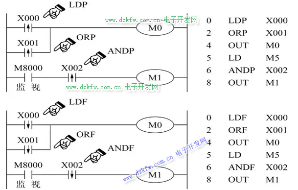 LDP、ANDP、ORP指令是進(jìn)行上升沿檢出的觸點(diǎn)指令,僅在指定位元件的上升沿時(shí)(OFF→ON變化時(shí))接通一個(gè)掃描周期;