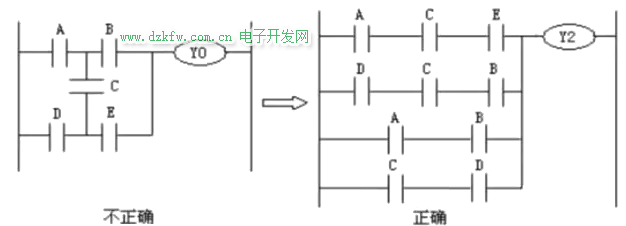 梯形圖的接點(diǎn)應(yīng)畫在水平線上,不能畫在垂直分支。