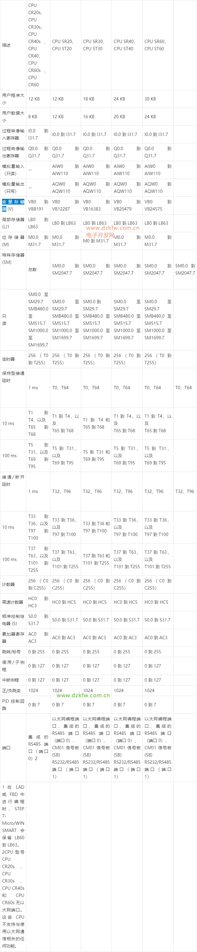 下表提供了固件版本為 V2.5 的 CPU 的存儲器范圍和特性。對于固件版本低于 V2.5 的 CPU,請參見《S7-200 SMART 系統(tǒng)手冊》了解特定 CPU 型號和版本。
