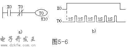 如圖5-6所示采用定時器T0產生一個周期可調節的連續脈沖。當X0常開觸點閉合后,第一次掃描到T0常閉觸點時,它是閉合的,于是T0線圈得電,經過1s的延時,T0常閉觸點斷開。T0常閉觸點斷開后的下一個掃描周期中,當掃描到T0常閉觸點時,因它已斷開,使T0線圈失電,T0常閉觸點又隨之恢復閉合。這樣,在下一個掃描周期掃描到T0常閉觸點時,又使T0線圈得電,重復以上動作,T0的常開觸點連續閉合、斷開,就產生了脈寬為一個掃描周期、脈沖周期為1s的連續脈沖。改變T0的設定值,就可改變脈沖周期。