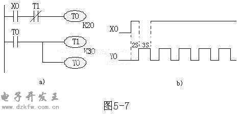 如圖5-7所示為采用兩個定時器產生連續脈沖信號,脈沖周期為5秒,占空比為3:2(接通時間:斷開時間)。接通時間3s,由定時器T1設定,斷開時間為2s,由定時器T0設定,用Y0作為連續脈沖輸出端。