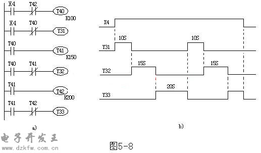 如圖5-8a所示為用三個定時器產生一組順序脈沖的梯形圖程序,順序脈沖波形如圖5-8b所示。當X4接通,T40開始延時,同時Y31通電,定時l0s時間到,T40常閉觸點斷開,Y31斷電。T40常開觸點閉合,T41開始延時,同時Y32通電,當T41定時15s時間到,Y32斷電。T41常開觸點閉合,T42開始延時.同時Y33通電,T42定時20s時間到,Y33斷電。如果X4仍接通,重新開始產生順序脈沖,直至X4斷開。當X4斷開時,所有的定時器全部斷電,定時器觸點復位,輸出Y31、Y32及Y33全部斷電。