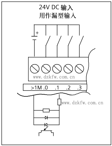 漏型輸入:電流經(jīng)外部開關(guān)流入PLC內(nèi)部,1M端接電源負(fù)極。
