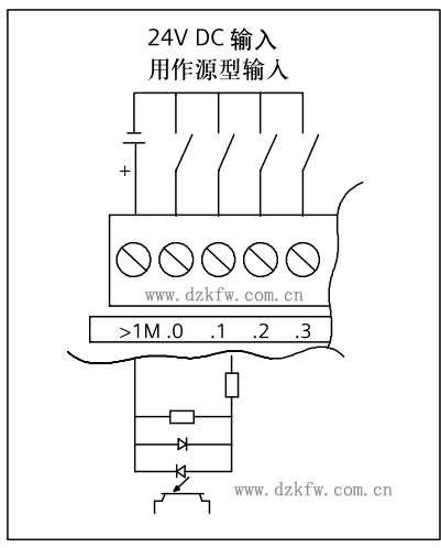 源型輸入:電流從PLC內(nèi)部流出經(jīng)外部開關(guān)至電源負(fù)極,1M端接電源正極。