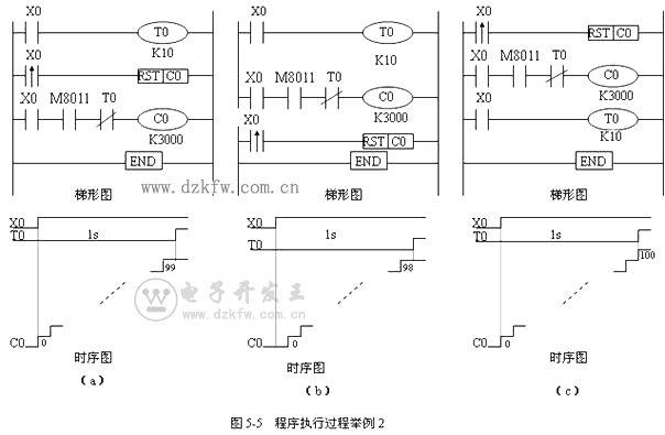 本例無實際意義,但非常有利于分析程序執行過程。系統輸入端只需接一個按鈕,無輸出,參考圖5-2,只接X0。分析圖5-5中,(a)、(b)、(c)三種情況下,觀察計數器的當前值,分析程序執行過程。