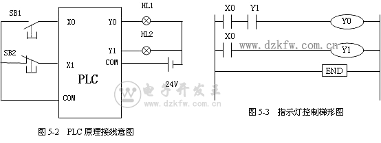 圖5-2為PLC接線圖,圖5-3為控制梯形圖。圖5-4描述了每個掃描周期程序的執行過程。按鈕SB2雖然在程序中沒有使用,但其狀態仍影響其對應編號的內部輸入繼電器的狀態。圖(a)中,①輸入掃描過程,將兩個按鈕的狀態掃描后,存入其映像區,由于SB2是停止按鈕,所以,即使沒有按下,其輸入回路也是閉合的,因此,X1存“1”(ON狀態),而其它位存“0”(OFF狀態)。②執行程序過程,程序根據所用到觸點的編號對應的內部繼電器狀態來運算。由于X0處于OFF狀態,因此,對應的動合觸點處于斷開狀態,運算結果是Y0、Y1處于OFF狀態,其結果存入輸出映像區,即Y0、Y1存“0”。③輸出刷新過程,根據映像區各位的狀態驅動輸出設備,由于輸出映像區均為OFF狀態,所以,輸出指示燈不能形成閉合回路,燈不亮。如果輸入不發生變化,內部繼電器的狀態均不發生變化。圖(b)中,按下SB1按鈕后,X0輸入回路閉合。①輸入掃描將輸入狀態存入其映像區,X0、X1均存“1”。②執行程序過程,按照從左到右,從上到下的原則,逐條執行。第一行,X0觸點閉合,但此時,Y1的狀態為“0”,因此,Y1觸點為斷開狀態,Y0沒能導通,其狀態為“0”。第二行,X0觸點閉合,所以,Y1的狀態為“1”。③輸出刷新過程,由于Y1呈導通狀態,燈2亮。
