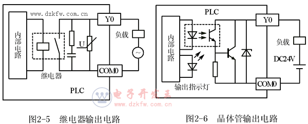 圖2-5是PLC繼電器輸出電路。內部電路使繼電器的線圈通電,它的常開觸點閉合,使外部負載得電工作。繼電器同時起隔離和功率放大作用,每一路只給用戶提供一對常開觸點。與觸點并聯的RC電路和壓敏電阻用來消除觸點斷開時產生的屯弧,以減輕它對CPU的干擾。