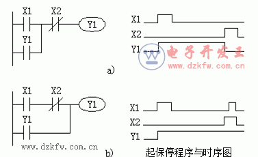 圖1a為停止優(yōu)先程序,即當X1和X2同時接通,則Y1斷開。圖1b為起動優(yōu)先程序,即當X1和X2同時接通,則Y1接通。起保停程序也可以用置位(SET)和復位(RST)指令來實現(xiàn)。在實際應用中,起動信號和停止信號可能由多個觸點組成的串、并聯(lián)電路提供。