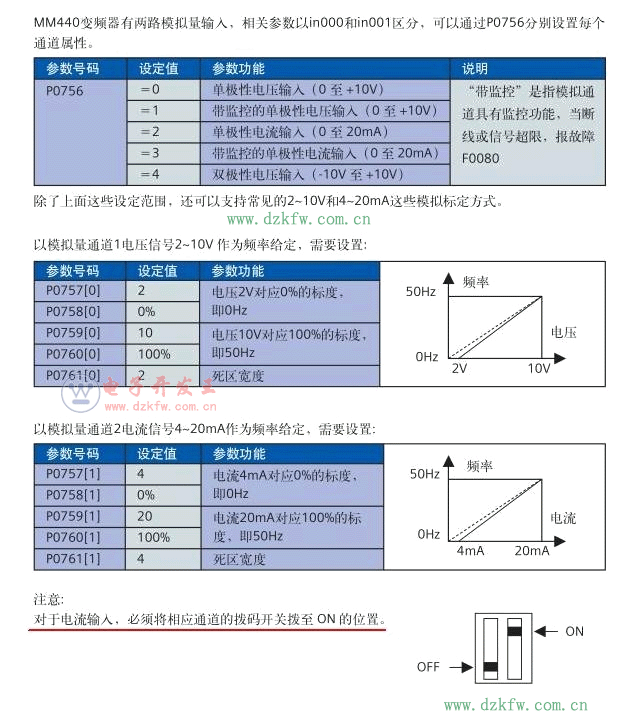 2.模擬量輸入(電壓或電流信號)僅僅修改P756是不夠的,還要將端子板上的DIP開關必須設定為正確的位置。見上傳圖片--變頻器模擬量輸入
