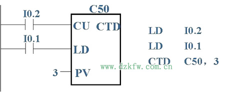 使該計(jì)數(shù)器在CD輸入的上升沿從預(yù)置值開(kāi)始遞減計(jì)數(shù)。當(dāng)當(dāng)前計(jì)數(shù)值(C×××)等于0時(shí),該計(jì)數(shù)器被置位。當(dāng)裝載輸入(LD)接通時(shí),計(jì)數(shù)器復(fù)位并把預(yù)設(shè)值(PV)裝載當(dāng)前值。