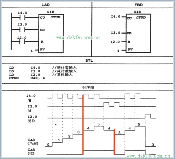 使該計(jì)數(shù)器在每CU輸入的上升沿,從當(dāng)前計(jì)數(shù)值開(kāi)始遞增計(jì)數(shù),在每一個(gè)CD輸入的上升沿,遞減計(jì)數(shù)。當(dāng)復(fù)位輸入(R)置位時(shí),計(jì)數(shù)器被復(fù)位。