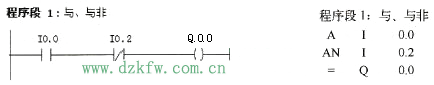 與、與非及輸出指令示例如圖1所示,圖中左側是梯形圖,右側是與梯形圖對應的指令表。當常開觸點I0.0和常閉觸點I0.2都接通時,輸出線圈Q0.0得電(Q0.0=1),Q0.0=1實際上就是運算結果RLO的數值,I0.0和I0.2是串聯關系。