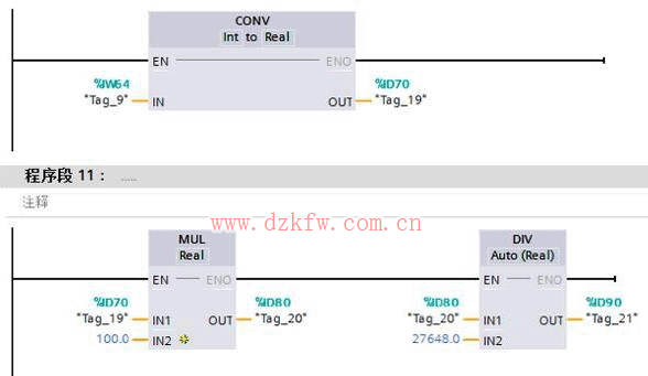 因?yàn)楣街蠭W64乘以100的運(yùn)算結(jié)果可能會(huì)大于16位整數(shù)的最大值32767(IW64為16位存儲(chǔ)器,模擬值為二進(jìn)制的補(bǔ)碼,最高位為符號(hào)位,0為負(fù),1為正),因此應(yīng)將IW64中的數(shù)值數(shù)據(jù)類型轉(zhuǎn)換為實(shí)數(shù)再進(jìn)行乘除運(yùn)算。