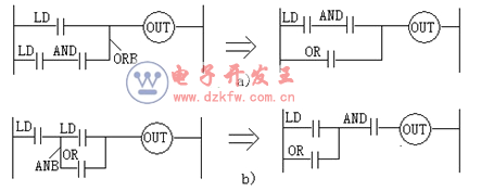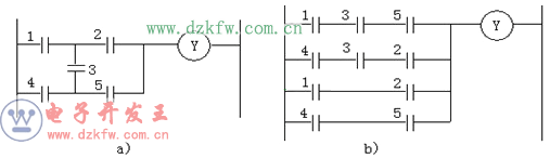 (4)有串聯(lián)線路相并聯(lián)時,應(yīng)將觸點最多的那個串聯(lián)回路放在梯形圖最上部。(m.diks.com.cn 版權(quán)所有)有并聯(lián)線路相串聯(lián)時,應(yīng)將觸點最多的那個并聯(lián)回路放在梯形圖最左邊。這種安排程序簡捷,語句少。
