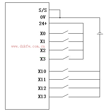 【8】在FX3U PLC的輸入端口接入無源開關,XO—X3使用內置24V電源,而在X10—X13使用外置電源?應如何接線?