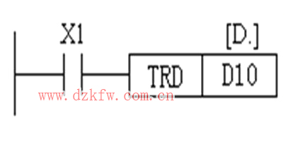 (3)時鐘數據讀取指令TRD(FNC166) TRD(P)指令為16位運算,占7個程序步。[D.]可取T,C和D。它的功能是讀出內置的實時時鐘的數據放進由[D.]開始的7個字內。如圖3-87所示,當X1為ON時,將實時時鐘(它們以年、月、日、時、分、秒、星期的順序存放在特殊輔助寄存器D8013~8019之中)傳送到D10~D16之中。