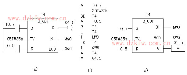 不論S端是什么狀態(tài),只要復(fù)位端R前的I0.5變?yōu)?時(shí),定時(shí)器T4復(fù)位,計(jì)時(shí)預(yù)置值和輸出觸頭Q4.5均被清0。
