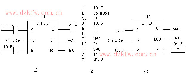 圖示脈沖擴(kuò)展定時(shí)器(SE)。當(dāng)S端由0變?yōu)?而產(chǎn)生上升沿時(shí),T4開始計(jì)時(shí),Q4.5保持為1計(jì)時(shí),到達(dá)后,Q4.5變?yōu)?。