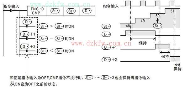 1). 16位運算(CMP、CMPP) 對比較值S1 和比較源 S2的內容進行比較,根據(jù)其結果 (小、一致、大 ),使 D、 D+1、D +2 其中一個為ON。