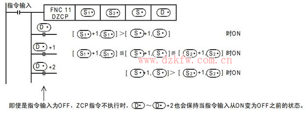 1). 16位運算(ZCP、ZCPP) 將比較源S1 的內容與下比較值 S2和上比較值S 進行比較,根據(jù)其結果(小、區(qū)域內、大),使D 、 D+1、D +2其中一個為ON。