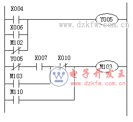 0 LD X004 1 OR X006 2 ORI M102 3 OUT Y005 4 LDI Y005 5 AND X007 6 OR M103 7 ANI X010 8 OR M110 9 OUT M103 | |||||||||||||