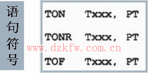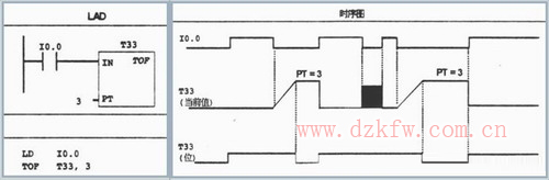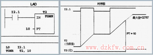 當使能輸入接通時,接通延時定時器和有記憶接通延時定時器開始計時,當定時器的當前值(Txxx)大于等于預設值時,該定時器位被置位。當使能輸入斷開時,清除接通延時定時器的當前值,而對于有記憶接通延時定時器,其當前值保持不變。可以用有記憶接通延時定時器累計輸入信號的接通時間,利用復位指令(R)清除其當前值。