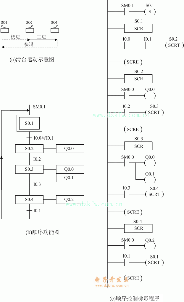 初始化脈沖SM0.1將初始狀態(tài)S0.1置位。當(dāng)按下起動按鈕時I0.0接通,S0.2置位,S0.2接通Q0.0實現(xiàn)快進(jìn)。當(dāng)快進(jìn)到位時,SQ2動作,使I0.2接通, S0.3置位,而S0.2復(fù)位, Q0.0繼續(xù)接通,并且Q0.1也同時接通,轉(zhuǎn)為工進(jìn)。工進(jìn)到位時SQ3動作使I0.3接通,S0.4置位使Q0.2接通,滑臺快退回原點(diǎn)使SQ1動作而I0.1接通,S0.1重新置位,這時滑臺停止于原點(diǎn)等待下一次起動。