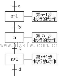 (1)步 在功能表圖中用矩形框表示步,方框內(nèi)是該步的編號(hào)。如圖1所示各步的編號(hào)為n-1、n、n+1。編程時(shí)一般用PLC內(nèi)部編程元件來(lái)代表各步,因此經(jīng)常直接用代表該步的編程元件的元件號(hào)作為步的編號(hào),如M300等,這樣在根據(jù)功能表圖設(shè)計(jì)梯形圖時(shí)較為方便。