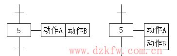 (3)動(dòng)作 一個(gè)控制系統(tǒng)可以劃分為被控系統(tǒng)和施控系統(tǒng),例如在數(shù)控車(chē)床系統(tǒng)中,數(shù)控裝置是施控系統(tǒng),而車(chē)床是被控系統(tǒng)。對(duì)于被控系統(tǒng),在某一步中要完成某些“動(dòng)作”,對(duì)于施控系統(tǒng),在某一步中則要向被控系統(tǒng)發(fā)出某些“命令”,將動(dòng)作或命令簡(jiǎn)稱(chēng)為動(dòng)作,并用矩形框中的文字或符號(hào)表示,該矩形框應(yīng)與相應(yīng)的步的符號(hào)相連。如果某一步有幾個(gè)動(dòng)作,可以用如圖2所示的兩種畫(huà)法來(lái)表示,但是圖中并不隱含這些動(dòng)作之間的任何順序。