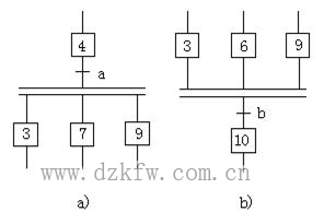 (3)并行序列 并行序列的開(kāi)始稱(chēng)為分支,如圖4a所示,當(dāng)轉(zhuǎn)換條件的實(shí)現(xiàn)導(dǎo)致幾個(gè)序列同時(shí)激活時(shí),這些序列稱(chēng)為并行序列。當(dāng)步4是活動(dòng)步,并且轉(zhuǎn)換條件a=1、3、7、9這三步同時(shí)變?yōu)榛顒?dòng)步,同時(shí)步4變?yōu)椴换顒?dòng)步。為了強(qiáng)調(diào)轉(zhuǎn)換的同步實(shí)現(xiàn),水平連線用雙線表示。步3、7、9被同時(shí)激活后,每個(gè)序列中活動(dòng)步的進(jìn)展將是獨(dú)立的。在表示同步的水平雙線之上,只允許有一個(gè)轉(zhuǎn)換符號(hào)。