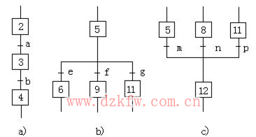 (2)選擇序列 選擇序列的開(kāi)始稱(chēng)為分支,如圖3b所示,轉(zhuǎn)換符號(hào)只能標(biāo)在水平連線之下。如果步2是活動(dòng)的,并且轉(zhuǎn)換條件e=1,則發(fā)生由步5