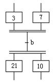 并行序列的結(jié)束稱(chēng)為合并,如圖4b所示,在表示同步的水平雙線之下,只允許有一個(gè)轉(zhuǎn)換符號(hào)。當(dāng)直接連在雙線上的所有前級(jí)步都處于活動(dòng)狀態(tài),并且轉(zhuǎn)換條件b=1時(shí),才會(huì)發(fā)生步3、6、9到步10的進(jìn)展,即步3、6、9同時(shí)變?yōu)椴换顒?dòng)步,而步10變?yōu)榛顒?dòng)步。并行序列表示系統(tǒng)的幾個(gè)同時(shí)工作的獨(dú)立部分的工作情況。