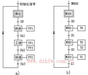 如果PLC已經(jīng)確定,可直接用編程元件M300~M303(FX系列)來(lái)代表這四步,設(shè)輸入/輸出設(shè)備與PLC的I/O點(diǎn)對(duì)應(yīng)關(guān)系如表2所示,則可直接畫(huà)出如圖7b所示的功能表圖接線圖,圖中M8002為FX系列PLC的產(chǎn)生初始化脈沖的特殊輔助繼電器。