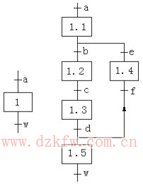 (1)有向連線 在功能表圖中,隨著時(shí)間的推移和轉(zhuǎn)換條件的實(shí)現(xiàn),將會(huì)發(fā)生步的活動(dòng)狀態(tài)的順序進(jìn)展,這種進(jìn)展按有向連線規(guī)定的路線和方向進(jìn)行。在畫(huà)功能表圖時(shí),將代表各步的方框按它們成為活動(dòng)步的先后次序順序排列,并用有向連線將它們連接起來(lái)。活動(dòng)狀態(tài)的進(jìn)展方向習(xí)慣上是從上到下或從左至右,在這兩個(gè)方向有向連線上的箭頭可以省略。如果不是上述的方向,應(yīng)在有向連線上用箭頭注明進(jìn)展方向。