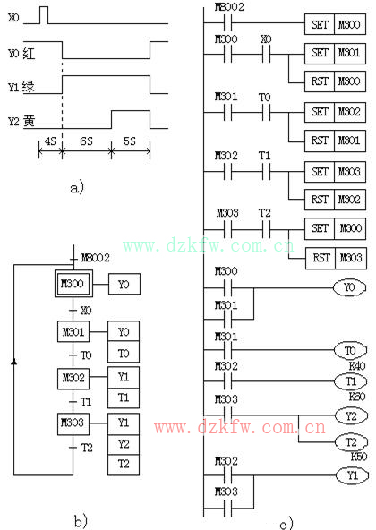 a)時序圖 b)功能表圖 c)以轉換為中心編程的梯形圖