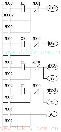 1)某一輸出繼電器僅在某一步中為“1”狀態,如Y1和Y2就屬于這種情況,可以將Y1線圈與M303線圈并聯,Y2線圈與M302線圈并聯?雌饋碛眠@些輸出繼電器來代表該步(如用Y1代替M303),可以節省一些編程元件,但PLC的輔助繼電器數量是充足、夠用的,且多用編程元件并不增加硬件費用,所以一般情況下全部用輔助繼電器來代表各步,具有概念清楚、編程規范、梯形圖易于閱讀和容易查錯的優點。