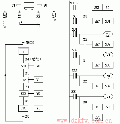 為了便于分析,我們假設剛開始執行用戶程序時,系統已處于初始步(用初始化脈沖M8002將初始步置位),代表其余各步的編程元件均為OFF,為轉換的實現做好了準備。