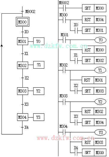 如圖7所示為某加熱爐送料系統的功能表圖與梯形圖。除初始步外,各步的動作分別為開爐門、推料、推料機返回和關爐門,分別用Y0、Y1、Y2、Y3驅動動作。X0<是起動按鈕,X1~X4分別是各動作結束的限位開關。與左側母線相連的M300~M304的觸點,其作用與STL觸點相似,它右邊的電路塊的作用為驅動負載、指定轉換條件和轉換目標,以及使前級步的輔助繼電器復位。