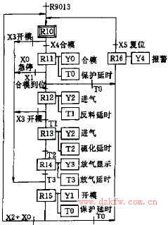 圖3是采用一臺日本松下F0C14RS控制單元和一臺E16RS擴展單元PLC控制一臺輪胎內胎硫化機的順序功能圖。它包含有跳步、循環、選擇序列等基本環節,一周期由初始、合模、反料、硫化、放氣、開模以及報警等七步組成。它們與輔助繼電器R10~R16相對應。在反料和硫化階段,Y2接通,蒸氣進入模具。在放氣階段,Y2斷開,放出蒸氣。反料階段允許打開模具,硫化階段則不允許。急停按扭X0可以停止開模操作,也可以將合模改為開模。