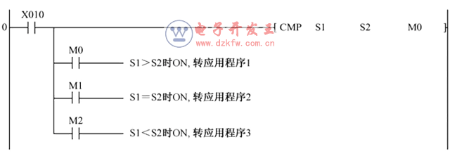 當常開觸點X010閉合,則比較指令執(zhí)行。它分三種情況:1,當S1>S2時M0執(zhí)行。2,當S1=S2則M1閉合。3,當S1