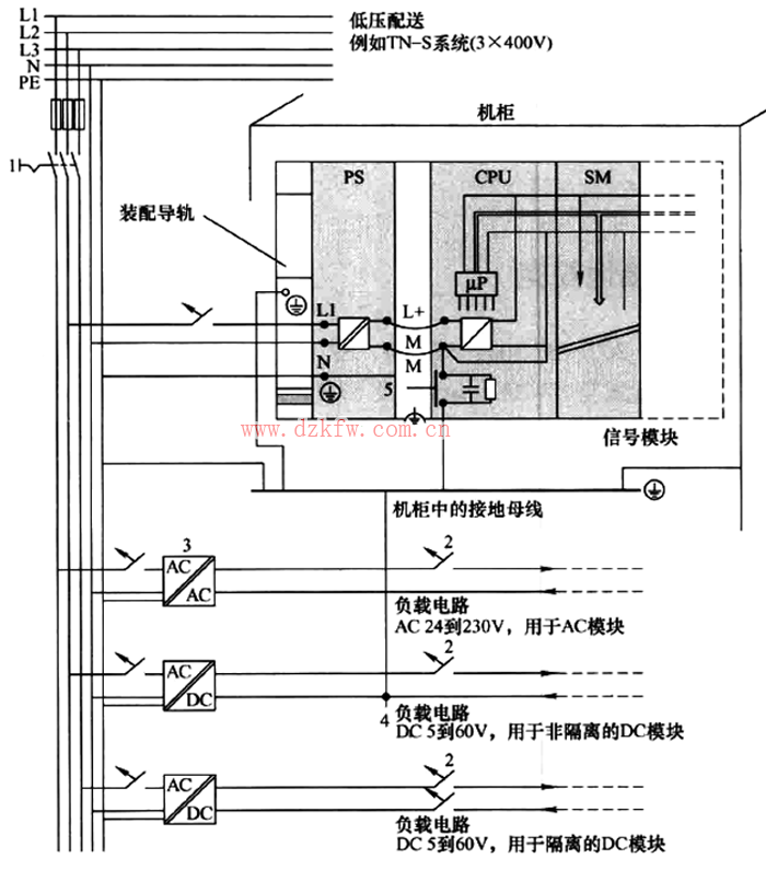 說明:1為主令開關;2為短路和過載保護;3為負載電流源(電氣隔離);4為接地導體的可拆卸連接,用于定位接地故障;5為CPU(非CPU 31×C)的接地滑動觸點。