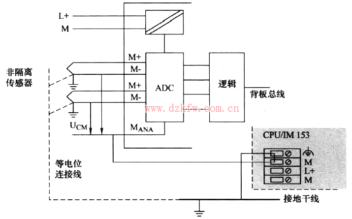 情況Ⅱ:將1非隔離傳感器連接到非隔離模擬量模板。如果將非隔離傳感器連接到非隔離模塊,請務必在接地模式下操作CPU/IM 153,如圖16所示。