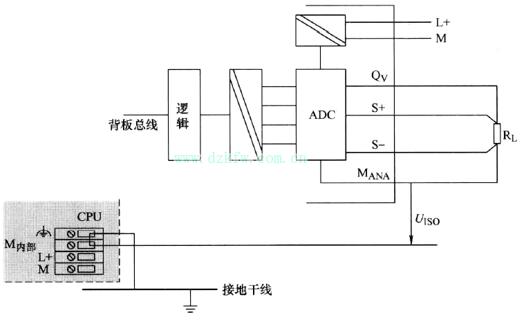 在EMC干擾強烈的環境中,建議將M-和MANA連接,以防超出CMV的限制值。對于VCM≤2.5V的模擬量模塊,必須將M-和MANA互連(推薦連接處)。