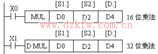 (3)乘法指令MUL (D) MUL (P)指令的編號為FNC22。數據均為有符號數。如圖3所示,當X0為ON時,將二進制16位數[S1.]、[S2.]相乘,結果送[D.]中。D為32位,即(D0)×(D2)→(D5,D4)(16位乘法);當X1為ON時,(D1,D0)×(D3,D2)→(D7,D6,D5,D4)(32位乘法)。