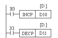 (5)加1和減1指令 加1指令(D) INC (P)的編號為FNC24;減1指令 (D) DEC (P)的編號為FNC25。INC和DEC指令分別是當條件滿足則將指定元件的內容加1或減1。如圖5所示,當X0為ON時,(D10)+1→(D10);當X1為ON時,(D11)+1→(D11)。若指令是連續指令,則每個掃描周期均作一次加1或減1運算。